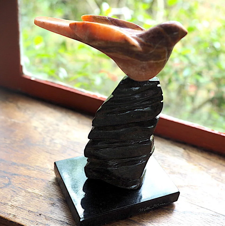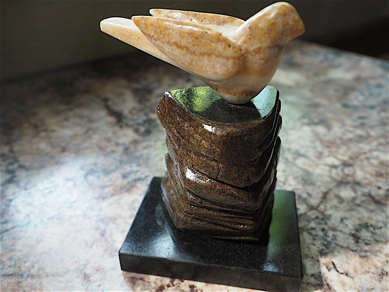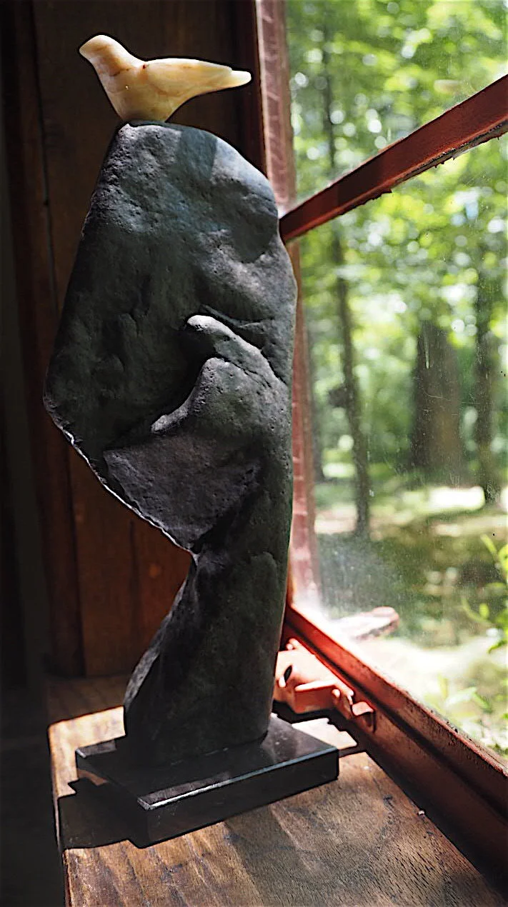 Italian Bardiglio Grey Marble on Naturally formed Basalt pedestal . . . perched happily on a windowsill in her new home in Lacey WA